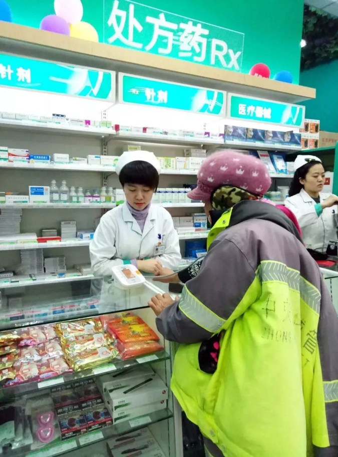 人民同泰学苑分店,店内设有免费检测血压的服务台,随时为环卫工人提供各方面服务。在店里测血压的宋师傅说:“我们环卫工人在户外作业,常有手指刮破的时候。每次来,店员都免费给包扎伤口,帮忙换药。我们队的环卫工都和店员认识了,谁血压高、谁低血糖,他们都知道。只要来就给测血压血糖,告诉应该注意什么,有个头疼脑热,店员还给感冒药吃,我们的心里都暖乎乎的。”