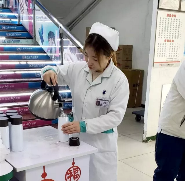 五满意分店店员一大早就买来了十多个保温杯,她说 :" 今天雪下得特别大,平时辖区的交警,环卫工休班的时候都愿意到店里来喝热水、量血压。今天他们一直执勤、清冰雪,根本没时间进屋来喝水,我们就决定把热水直接送到他们手中。"
