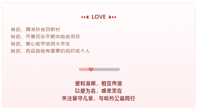 哈药集团作为一家具有社会责任的大型医药企业,始终关注留守儿童的健康和生活问题,为孩子们捐赠的物资和药品,切实为留守儿童解决实际困难,提升留守儿童的健康水平,用爱的力量许给孩子们一个健康的童年。