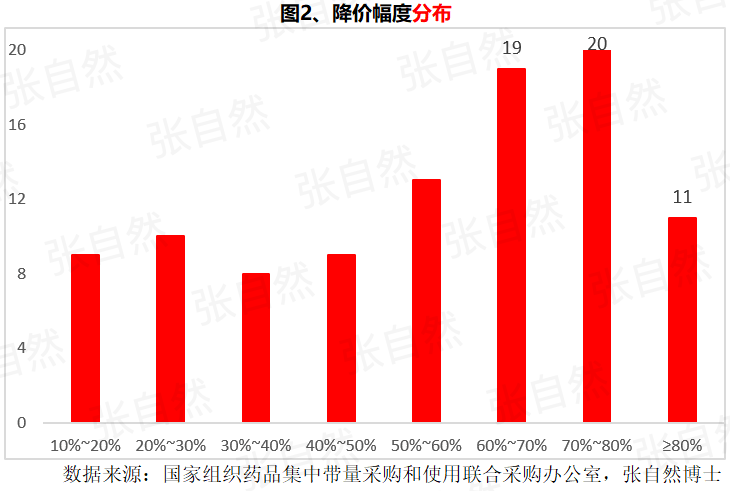 第二批带量采购降价幅度普遍较大,降价60%以上的占了一半,其中,降价区间在60%~70%和70%~80%的之间的分别有19个和20个品种(图2)。