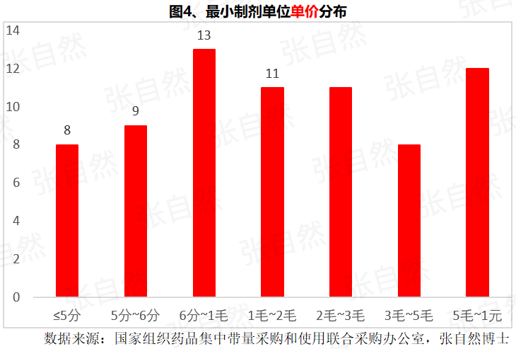 尽管按招标规则““单位可比价”≤0.1000元”“即可中选,但由于厂家并不满足,在0.1元之下仍进行了激烈厮杀,从而出现了<1元/片的达30个(占30%)之多,<5分钱的就有8个,在5分~6分之间仅1分钱之差的就有9个,6分~1毛之间的有13个(图4),所以说,本次集采实现了低价“复活”,药价立刻回到了几十年前几块钱就能买到100片/瓶的低价时代。