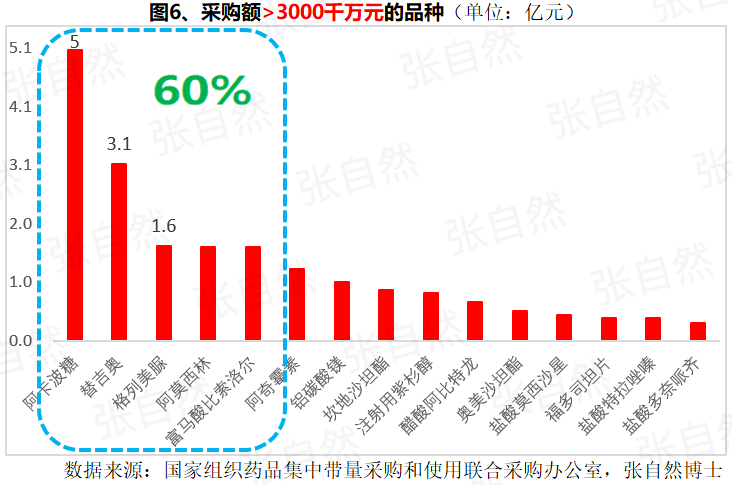 本次中选品种的总采购额约22亿元,其中采购额最大的是阿卡波糖,达5亿元,采购额最小的是安立生坦片,仅60万元,前者是后者的800多倍,其中,阿卡波糖、替吉奥、格列美脲、阿莫西林和富马酸比索洛尔5个品种的采购额就占了近6成(图6)。