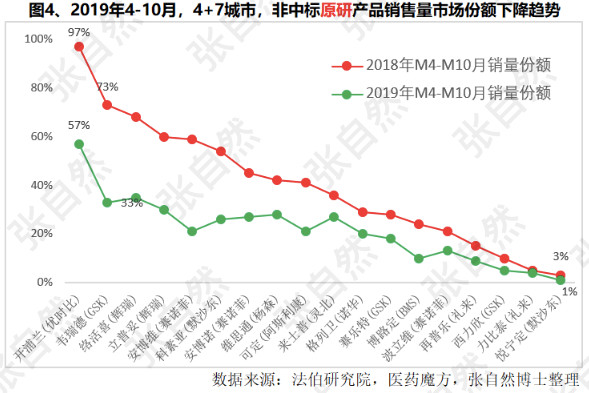 在4+7城市,2019年4-10月,非中标的原研产品的市场份额较2018年同期都有明显下降,其中,份额降幅最大的是开浦兰(优时比)和韦瑞德(GSK),都比2018年同期下降了40%,分别由2018年4-10月的97%和73%,下降到2019年同期的57%和33%,降幅最小的是力比泰(礼来)和悦宁定(默沙东),仅较2018年同期下降了1-2个百分点。