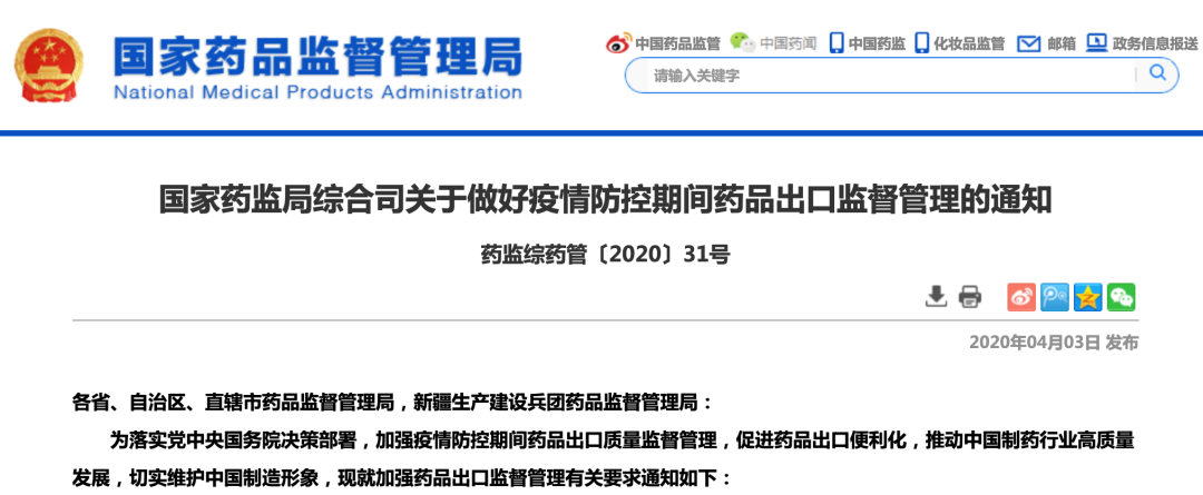 与日前发布的《药品注册管理办法》《药品生产监督管理办法》两部新规章的基调保持一致,《通知》重申将严格落实各方责任。要求药品上市许可持有人、药品生产企业不仅要依法承担药品质量安全责任,还应当严格遵守我国药品法律法规的规定,并按照进口国技术标准要求组织生产,保证其出口药品符合进口国(地区)的标准或者合同要求。此外,《通知》也要求各省级药品监管部门按照部署,做好疫情防控期间药品生产企业复工复产相关工作。