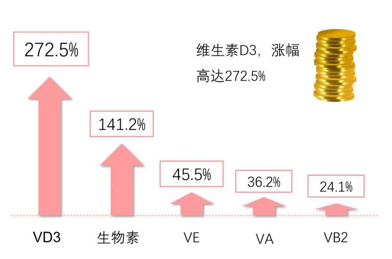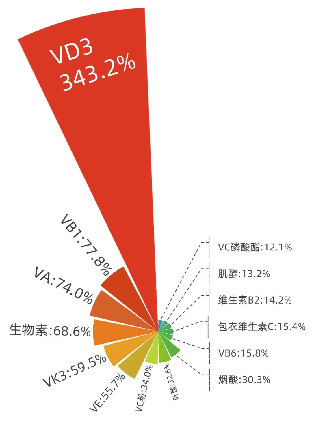 在欧洲市场上,受到全球疫情蔓延和部分生产企业停产的影响,维生素产品的价格同样出现一定的上涨。目前能查询的部分维生素产品价格数据显示,1月2日-4月2日平均价格涨幅最大仍是维生素D3,涨幅高达272.5%;其次是生物素,涨幅达到141.2%;维生素E、维生素A和维生素B2的涨幅也都超过20%。
