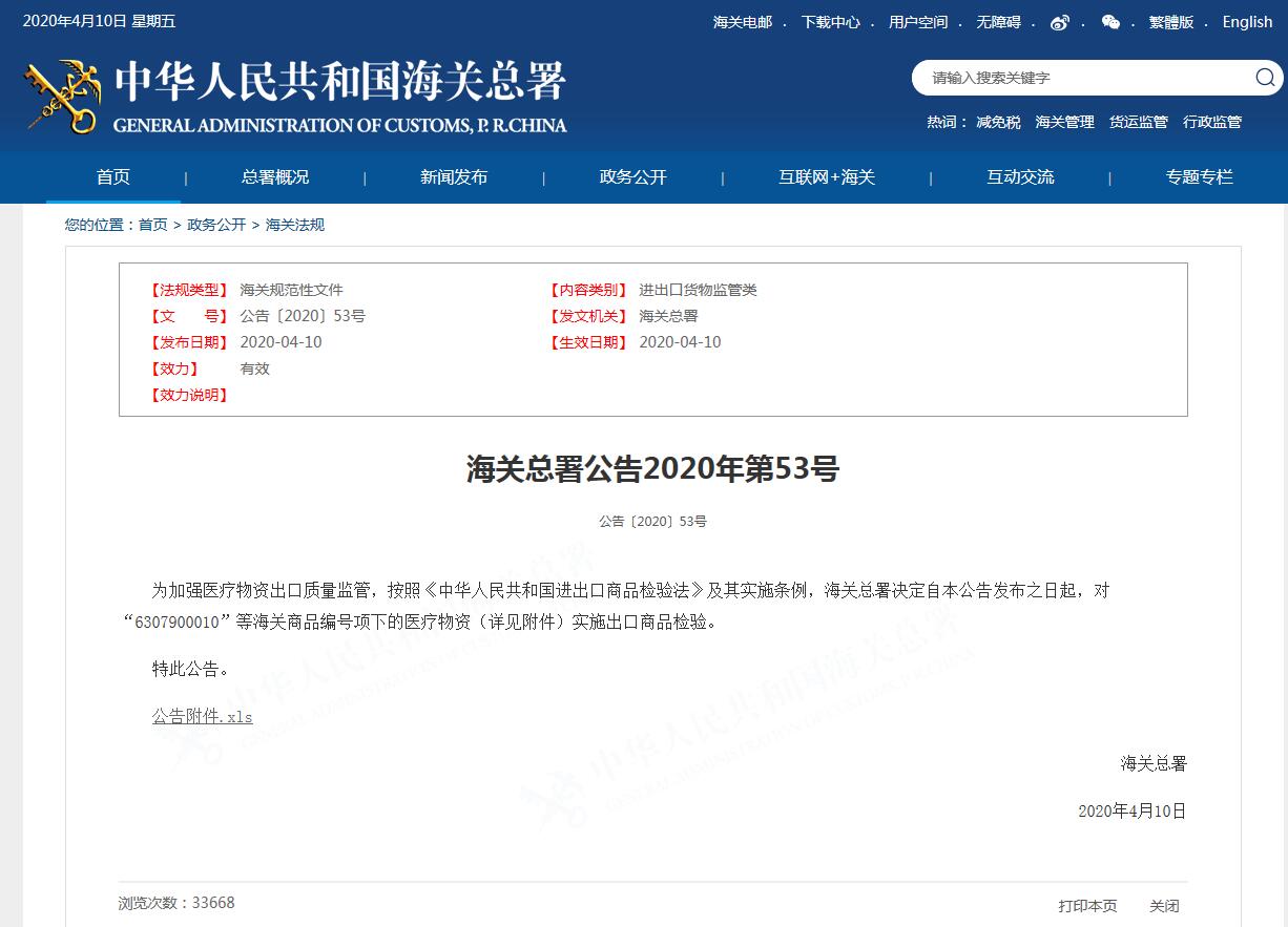 3月31日,商务部、海关总署、国家药品监督管理局联合发布《关于有序开展医疗物资出口的公告》,明确要求出口检测试剂、医用口罩、医用防护服、呼吸机、红外体温计等产品企业向海关报关时,须提供书面或电子声明,承诺出口产品已取得我国医疗器械产品注册证书,符合进口国(地区)的质量标准要求,海关凭药品监督管理部门批准的医疗器械产品注册证书验放。