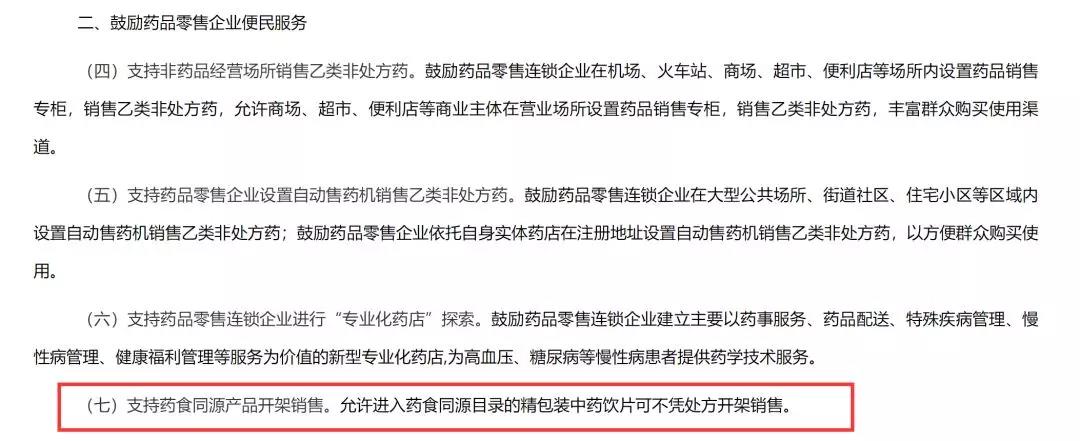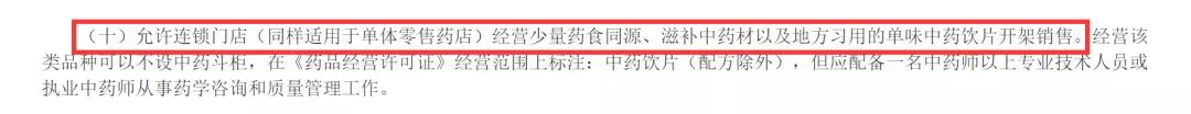 其中,《意见》第10项明确,“允许连锁门店(同样适用于单体零售药店)经营少量药食同源、滋补中药材以及地方习用的单味中药饮片开架销售。”