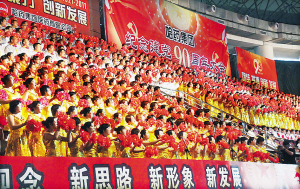 昨日,哈药集团举行纪念建党90周年大型演唱会,会上表彰了“四强”党组织和“四优”共产党员。全场5000余名员工高唱《没有共产党,就没有新中国》等歌曲,歌颂党的丰功伟绩,表达对党和祖国的无限热爱。 本报记者 刘阳洋 摄